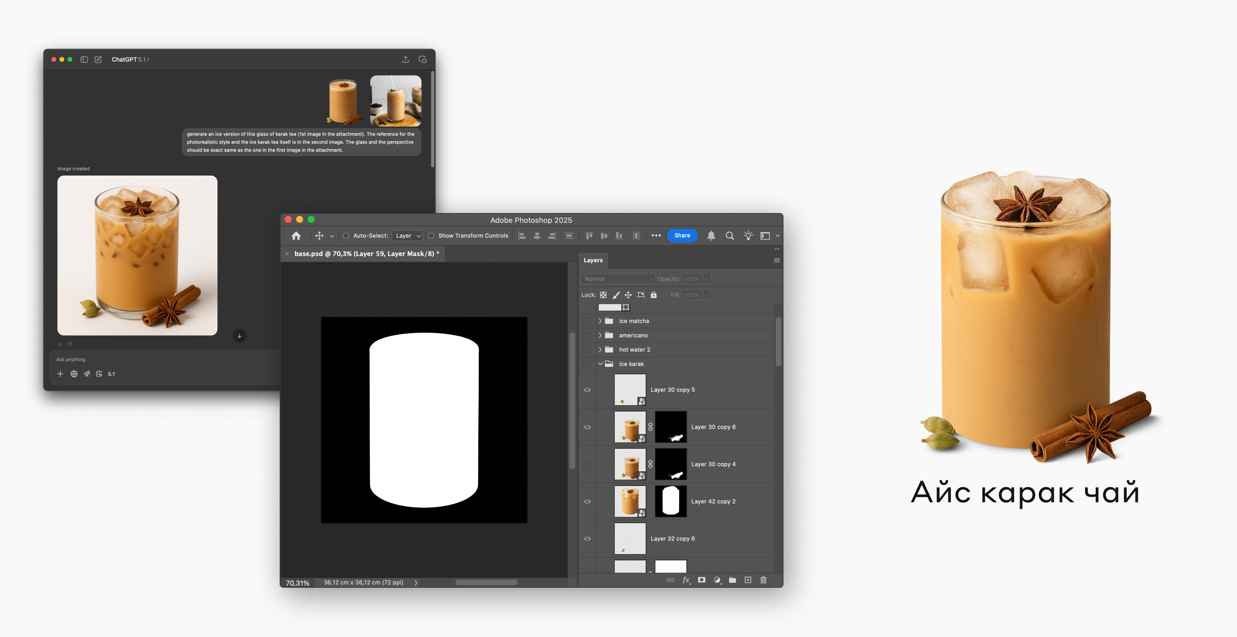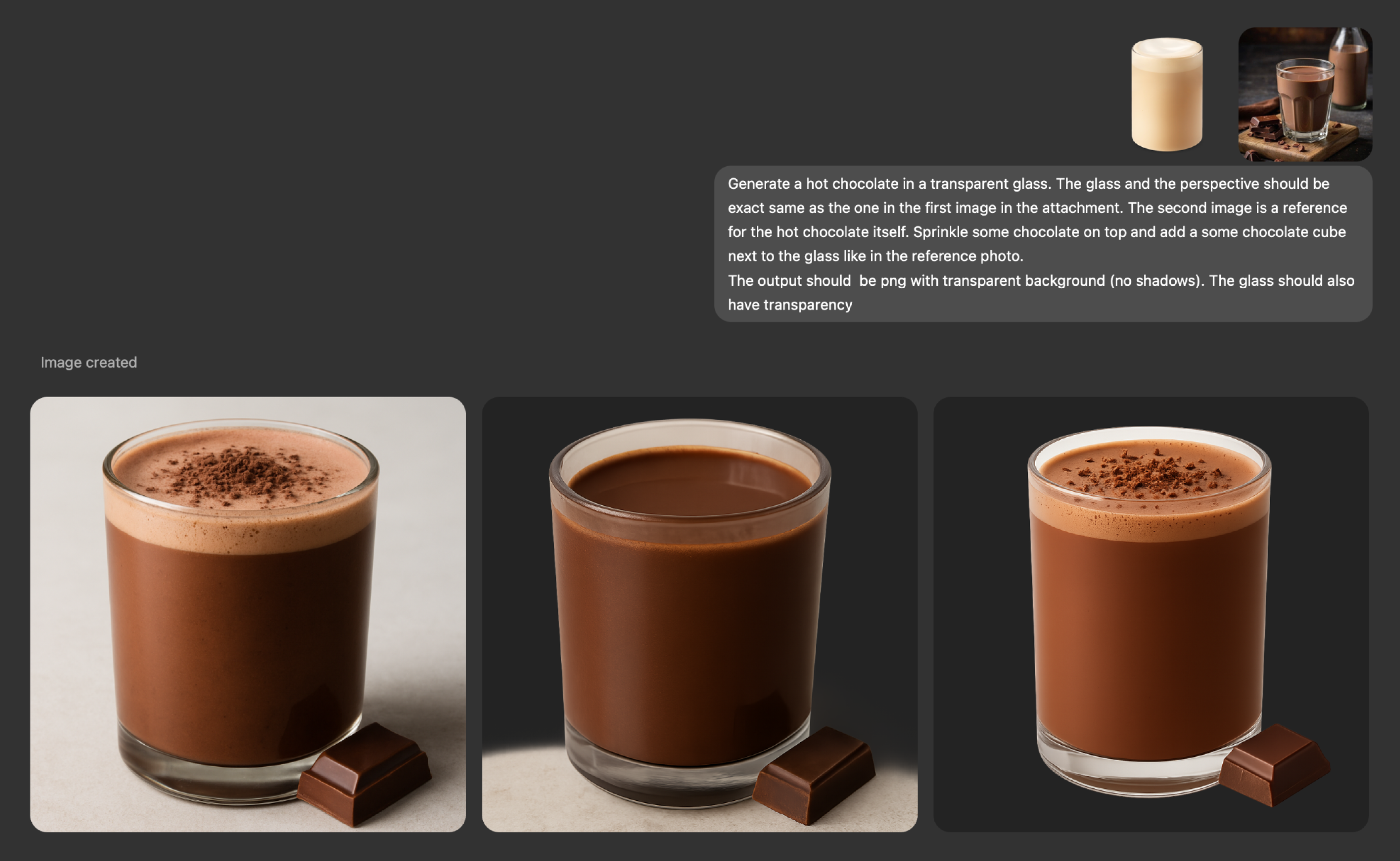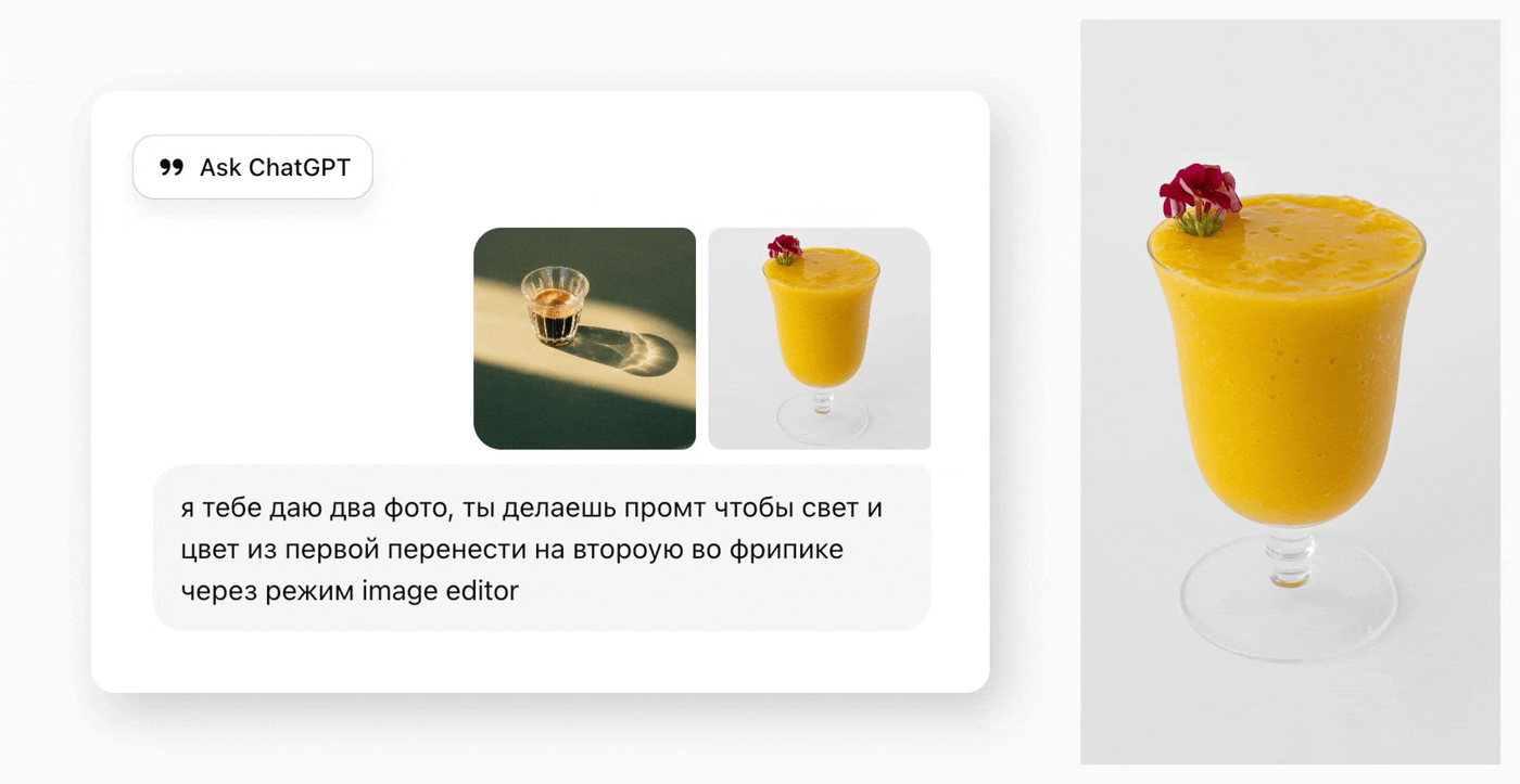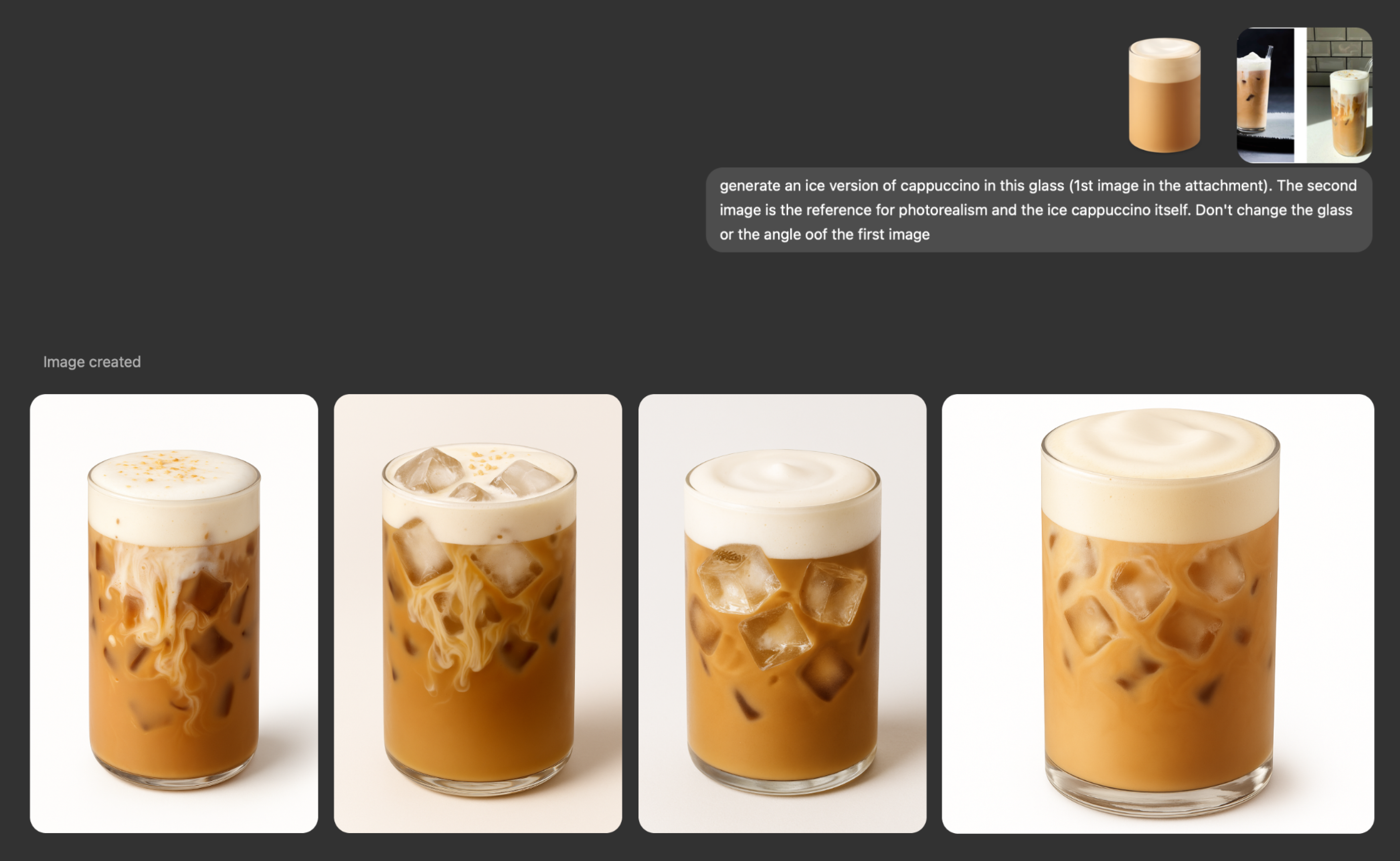 Мы решили сгенерировать изображения с помощью ChatGPT. Главная цель — добиться единообразия: одинаковые стаканы, ракурс и перспектива для всех напитков. Сначала выбрали форму стакана, затем подобрали референсы — отдельно для напитка и для стакана. Каждый кадр создавался на их основе.