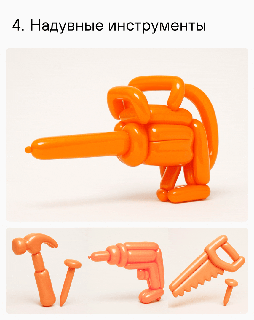Клиент выбрал концепцию с надувными инструментами и решил развивать её в рамках будущей кампании. Мы всего за пять дней придумали и визуализировали четыре идеи и выиграли тендер.Это реальный пример того, как нейросети ускоряют креатив, но не заменяют мышление.