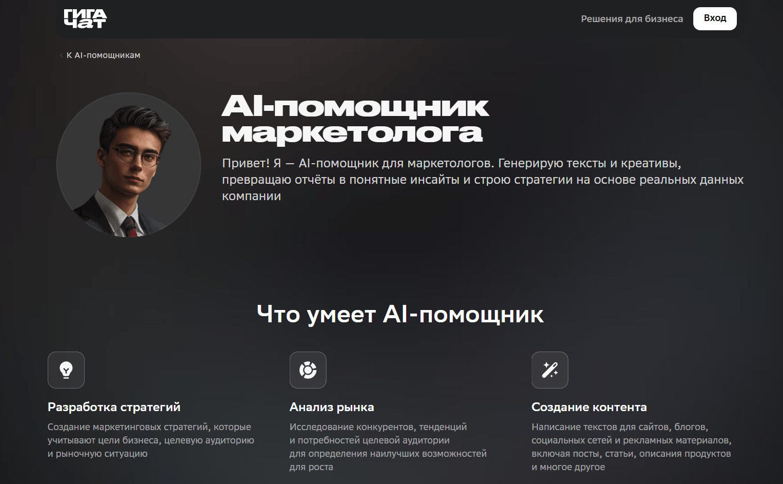 GigaChat (каталог промптов). Каталог готовых промптов для российской нейросети GigaChat. Есть раздел «AI-помощник маркетолога», который включает шаблоны для разработки стратегий, создания рекламных кампаний и анализа их эффективности.