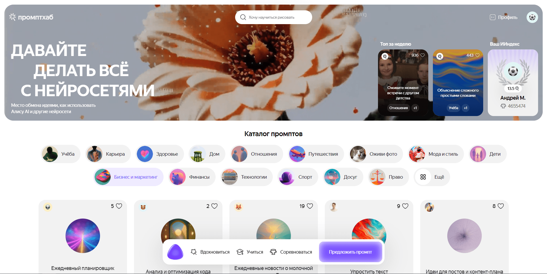 Промптхаб. Каталог промптов на любой случай жизни для Яндекс Алисы. Место обмена идеями, как использовать Алису AI и другие нейросети.
