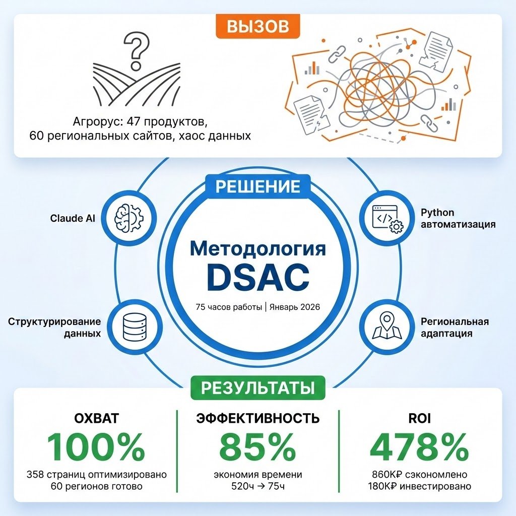 Мы подробно описали эту методологию в отдельной pdf статье: DSAC: Dynamic Seasonally-Adaptive Content— От идеи 2016 к стандарту индустрии. Если коротко — DSAC решает проблему, с которой сталкиваются все агрокомпании: традиционный маркетинг в агро не работает.