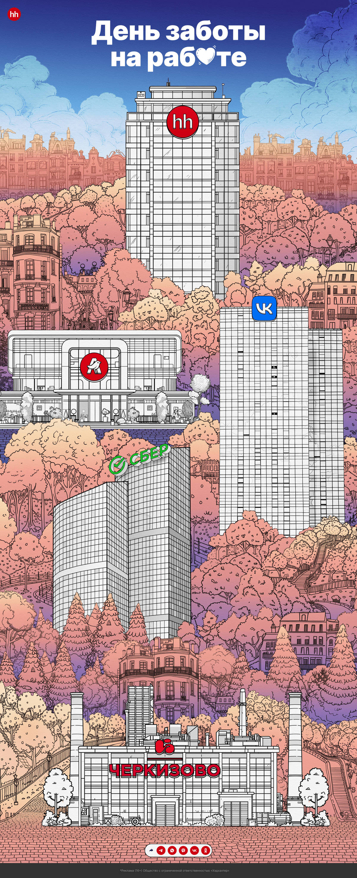 Ещё для одного спецпроекта мы сгенерировали городской пейзаж, и там тоже было много коллажей. Чтобы избежать несостыковок по стилю, мы генерировали всё в формате чёрно-белых контурных рисунков. Потом вручную раскрашивали как детскую раскраску и автоматически превращали слой в акварель.