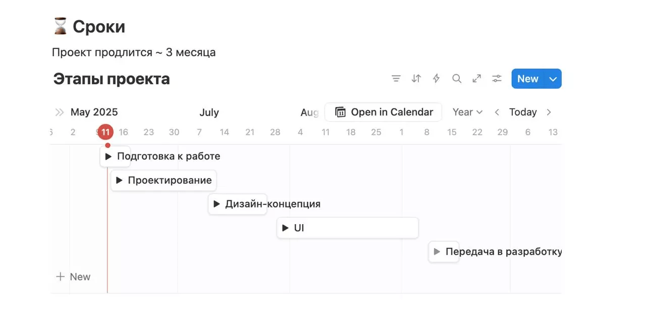 Для оценки мы используем нашу таблицу и таймлайн в Notion, которые потом и увидит клиент. Важно: считаем с адекватным запасом, но в рамках бюджета клиента, если он был озвучен.