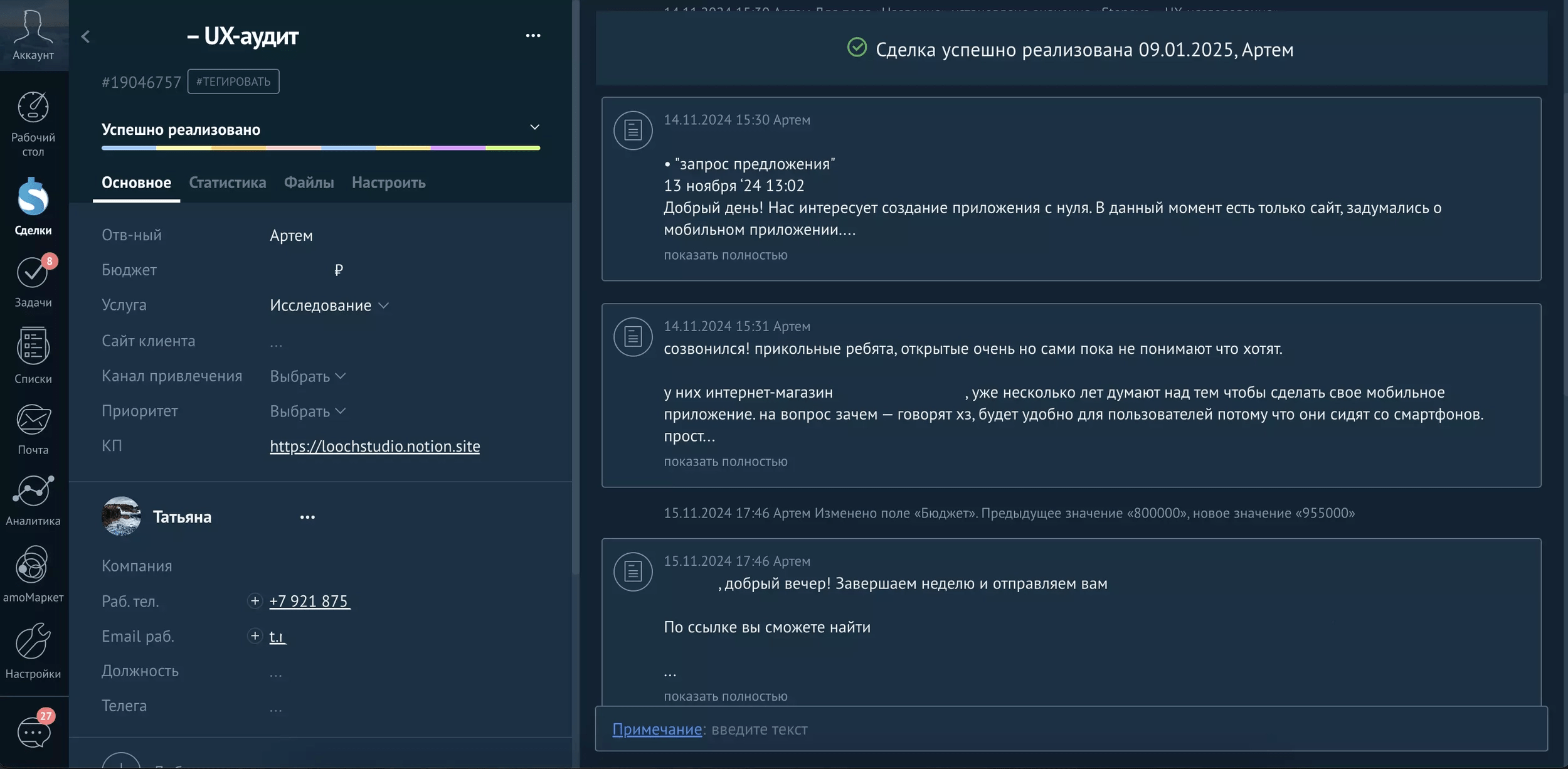 Пример карточки проекта в amoCRM