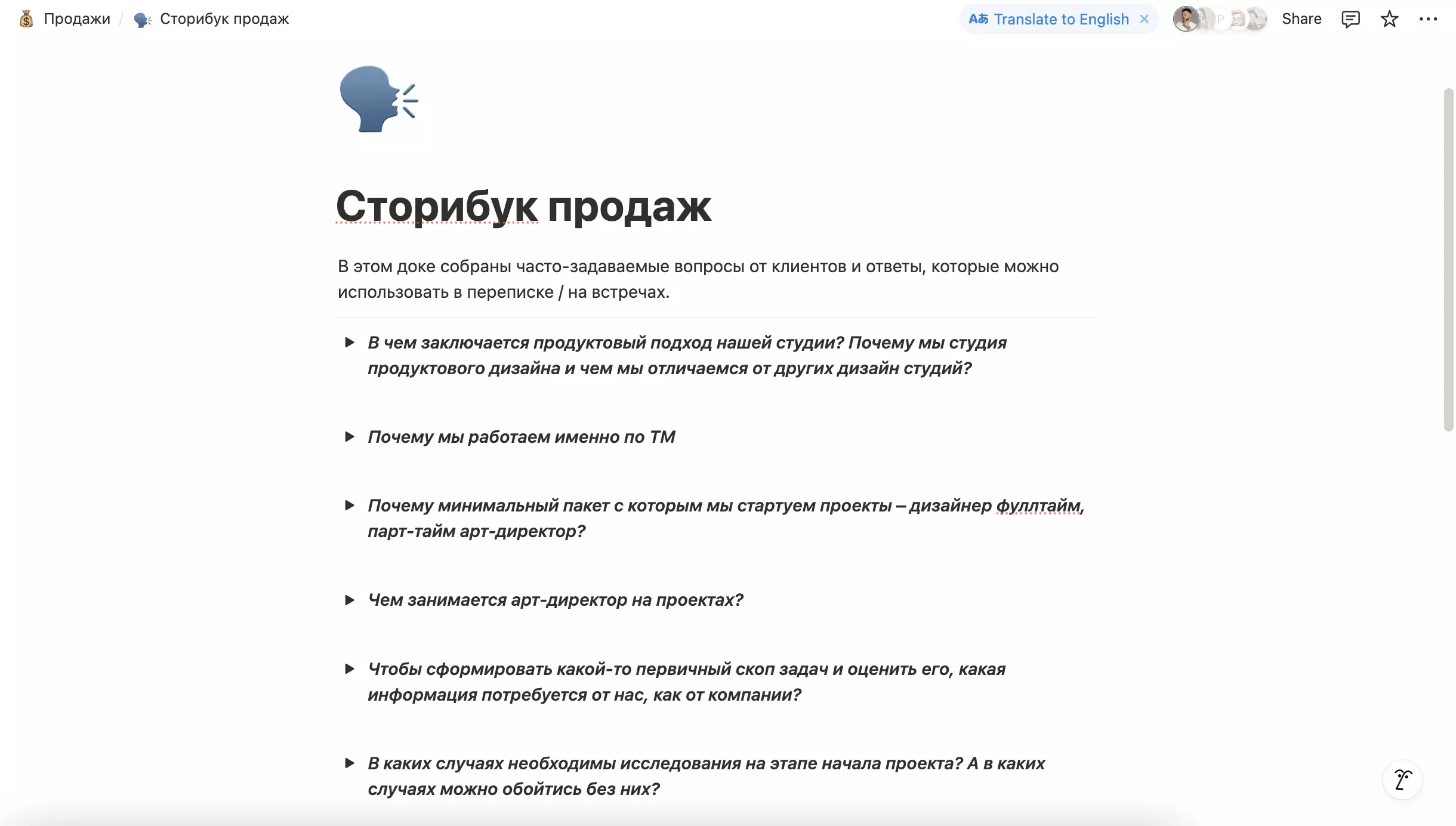 А еще на встречах помогает такой артефакт, как Сторибук продаж. Внутри него мы вместе с генеральным директором студии когда-то собрали большие ответы на часто-задаваемые вопросы наших клиентов. Туда можно зайти и скопировать быстрый и подробный ответ. Это удобно.