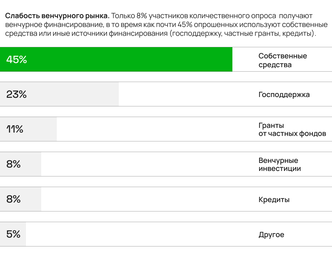Участники исследования отмечают институциональную поддержку как отдельный драйвер: венчурное финансирование, акселераторы, государственные гранты. В количественном опросе 9% упомянули участие в программах поддержки инноваций. Хотя венчурная экосистема для HealthTech развита слабо (только 8% стартапов получают венчурные инвестиции), инфраструктура постепенно формируется.