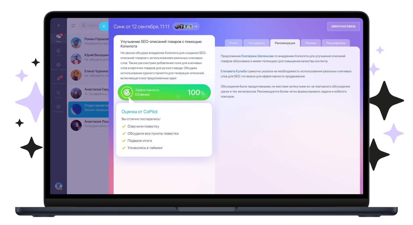 Видеозвонки стали полезнее с CoPilot follow-up: ИИ проанализирует звонки, составит протокол встречи, проанализирует диалог и предоставит идеи и рекомендации, расшифрует слово в слово и определит эффективность. В ближайшее время допустимое количество участников в Битрикс24 Синк, встроенных видеозвонках, увеличилось в 10 раз: со 100 до 1000 пользователей.