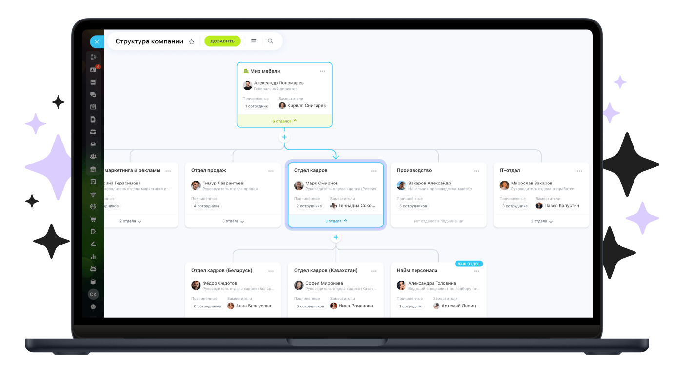 В Структуре появились новые роли — заместители — чаты отделов и установка прав по ролям. Все новые сотрудники будут автоматически добавлять в чаты и каналы отделов, уволенные — исключаться. У руководителей появилась гибкая настройка прав доступа для всего отдела. Для всех пользователей стал доступен поиск по отделу или сотруднику.