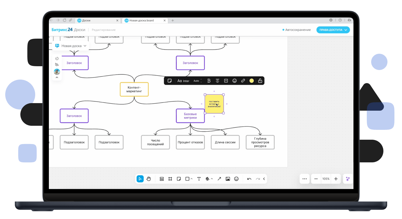 Доски работают прямо в Битрикс24, поэтому нет необходимости переключаться на похожие сервисы — всё собрано в одном. Файлы хранятся в формате .board, поэтому открываются везде, где поддерживается открытый формат. Работа с Досками доступна всем сотрудникам: можно ограничивать права и создавать доски для разных отделов, совместно редактировать и вести записи. На старте представят 20 шаблонов и импорт из Miro.