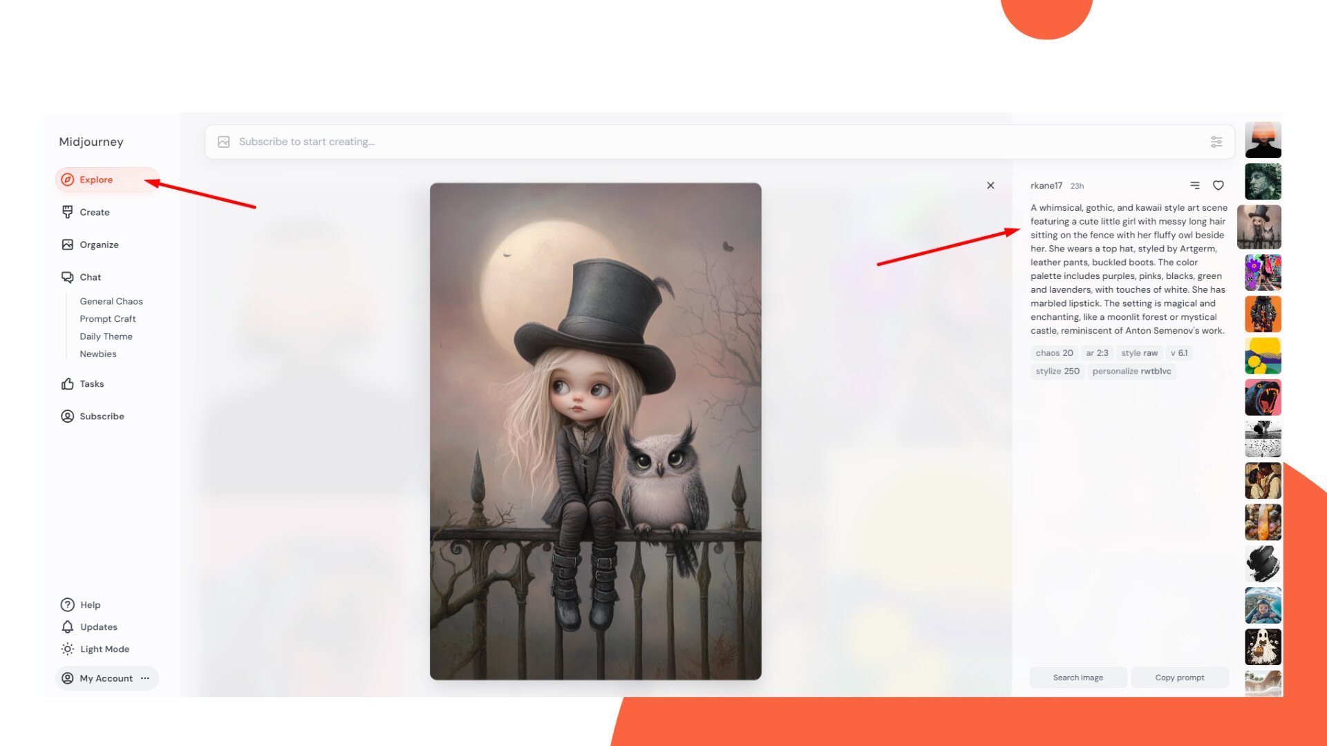 В разделе Explore можно посмотреть работы других авторов и промпты, которые они использовали.