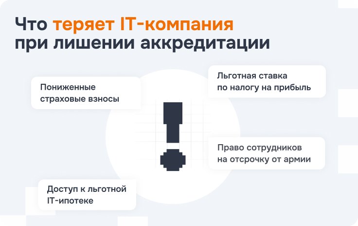 Аккредитация для IT-компании связана с конкретными льготами. Если статус будет аннулирован, компания теряет доступ к тем мерам поддержки, которые к нему привязаны. Перечислим следующие последствия: