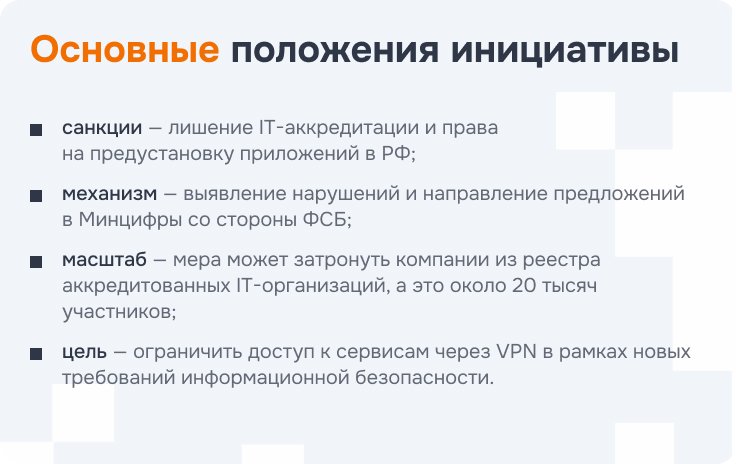 Сейчас обсуждается модель, при которой пропуск VPN-трафика через сервис начинают рассматривать как основание для регуляторных последствий в отношении самой компании. Речь идет о проекте постановления, но сама конструкция уже понятна: аккредитация, право на предустановку и часть действующих льгот связываются с выполнением новых требований по доступу и информационной безопасности.
