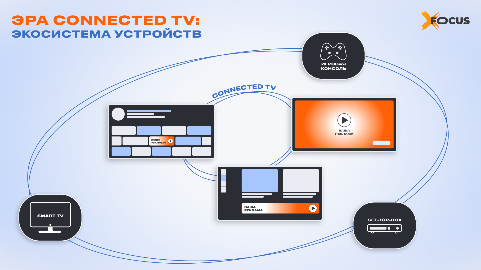 Важно понимать, что рост популярности Smart TV — это лишь часть более глобального тренда, известного как Advanced TV. Этот термин объединяет все современные технологии телерекламы, выходящие за рамки классического эфирного вещания. Ключевым компонентом Advanced TV является Connected TV (CTV) — экосистема устройств, подключенных к интернету для просмотра видеоконтента, куда, собственно, и входят Smart TV, а также игровые консоли (PlayStation, Xbox) и внешние медиаплееры (Apple TV и др.). Главная ценность Advanced TV для рынка заключается в том, что он совмещает в себе охват и вовлеченность большого экрана с точностью, измеримостью и гибкостью digital-инструментов.
