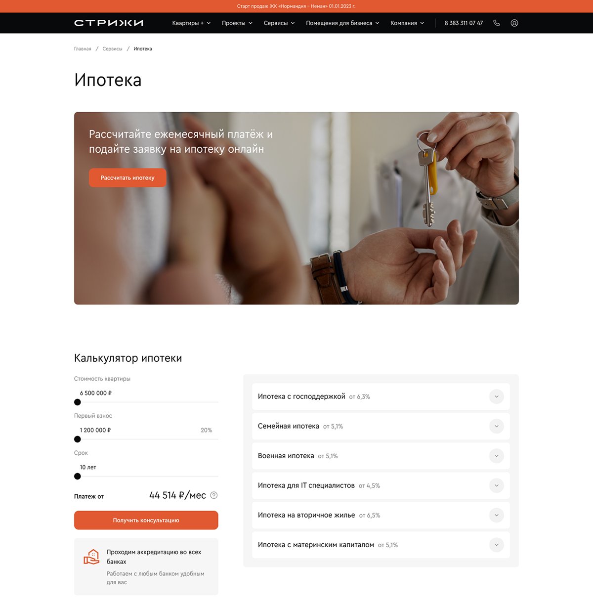 На сайте реализован функциональный калькулятор ипотеки с динамическим обновлением платежей, а также подбор предложений от банков с возможностью выбора.