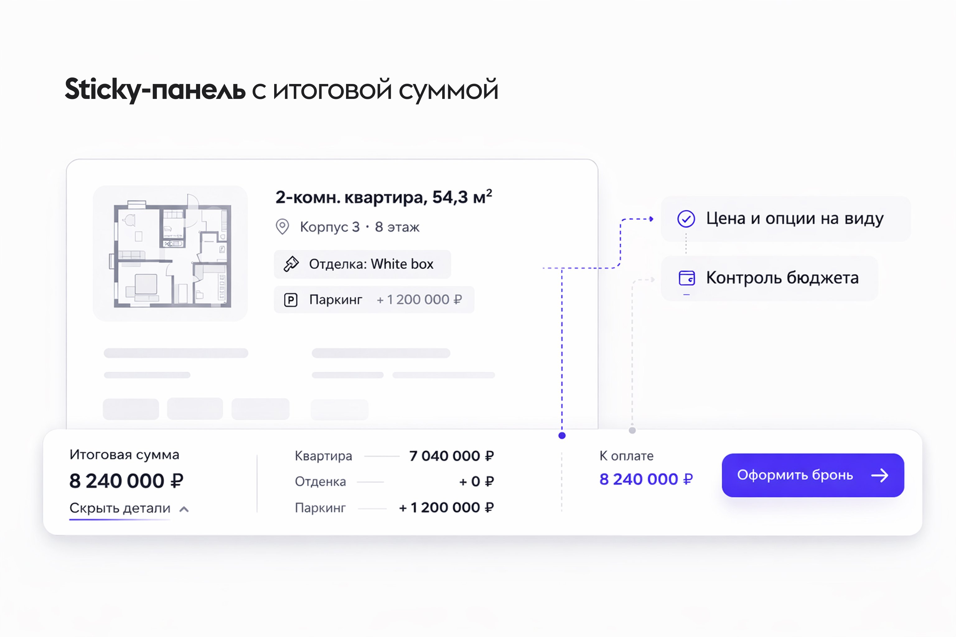 3. Sticky-панель с итоговой суммой — цена и опции не «теряются» при прокрутке.
