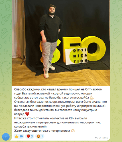Для нас Optimization — это в первую очередь люди. Та самая атмосфера, где можно вживую пообщаться с представителями поисковых систем, услышать аналитику от гуру рынка, успех и факапы, которые предшествовали крутым результатам.
