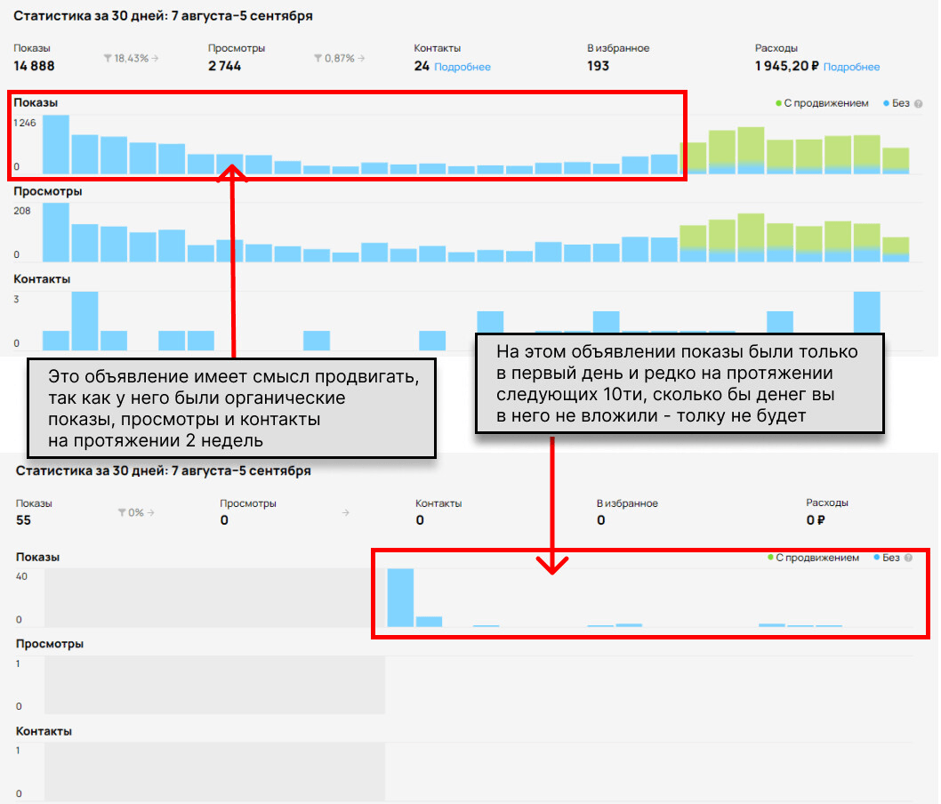 Распространенная ошибка — запускать платное продвижение для объявлений, которые изначально не собирают просмотров.