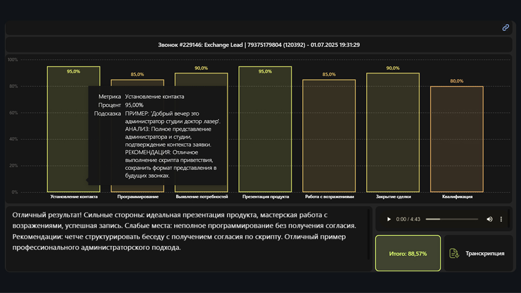Кроме того, меняется разговор между руководителем и менеджерами. Вместо «делай, как он» появляется язык конкретики: вот паттерн, который работает у сильных — попробуй внедрить его в свои звонки, вот фрагмент, где ты каждый раз теряешь клиента — давай разберём, что изменить. ИИ в этом смысле становится посредником между опытом лучших и ростом остальных: он поднимает данные, показывает закономерности и помогает видеть не только результат, но и путь к нему.