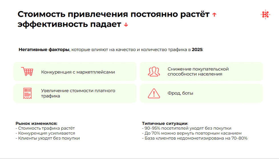 Органический поиск продолжает приводить людей с реальным спросом. Работа с клиентской базой позволяет доводить этот интерес до первой и повторных покупок. По отдельности эти подходы выполняют свои задачи, но не решают главную — превращать спрос в деньги без постоянного наращивания привлечения.