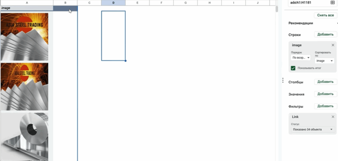 Можно на этом листе их сразу обработать. То есть удаляем лишнее. Для этого выделяем столбец и выбираем “Удалить дубликаты”. После этого у нас с вами остались только ячейки, где есть изображение.