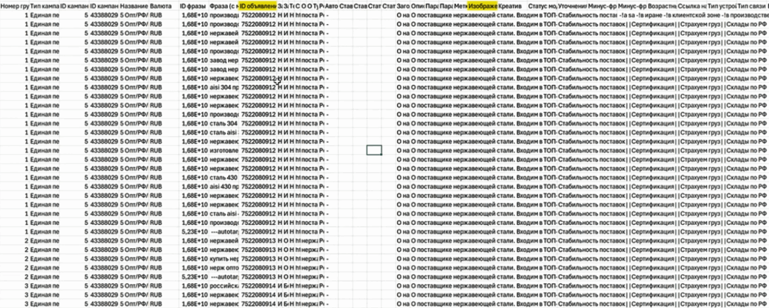Полученные данные копируем и вставляем в наш основной документ, который получили при выгрузке из Яндекс Директ. В нём создаём новый лист и столбцы из выгрузки Директ Коммандер добавляем туда.