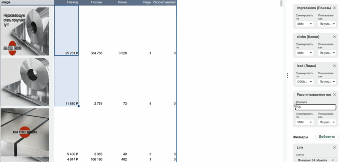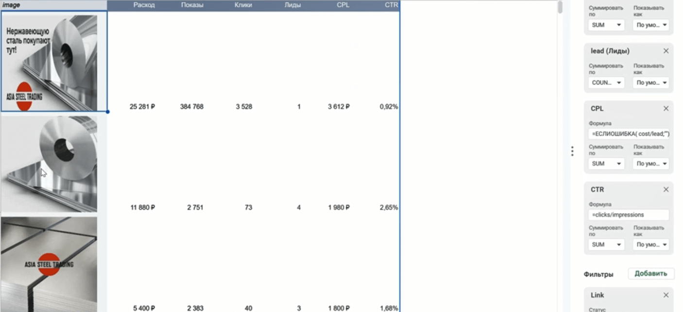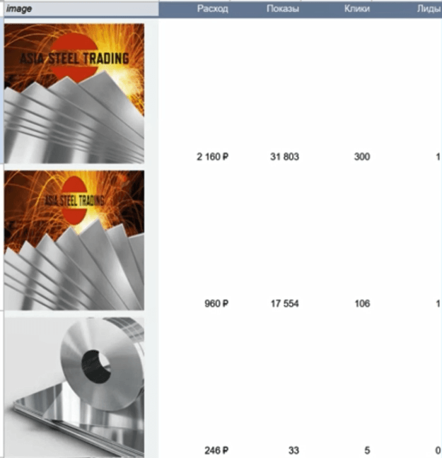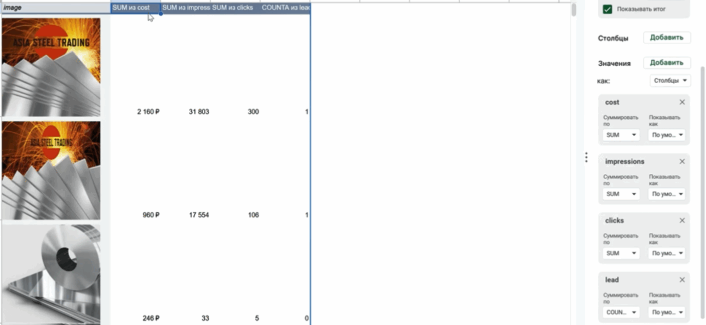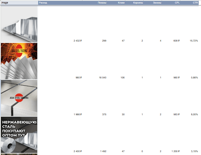 Мы получаем сводную таблицу, где есть у нас с вами картинки и есть основные метрики: это расход, показы, клики, микроцели какие-то, финальные цели заказа, стоимость лида, стоимость заказа, CTR как метрика кликабельности. Добавить можно любые, я вывел основные просто для того, чтобы показать, как это делать.