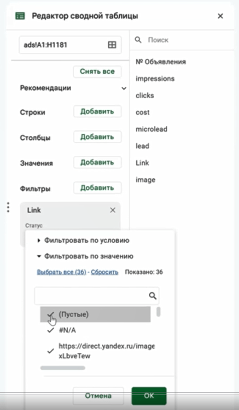 Чтобы в сводной таблице сразу отфильтровать пустые строки, в меню справа выбираем “Link”. Перетягиваем его в фильтры. В поиске находим “Пустые” и “N/A” и убираем с этих пунктов галочки.