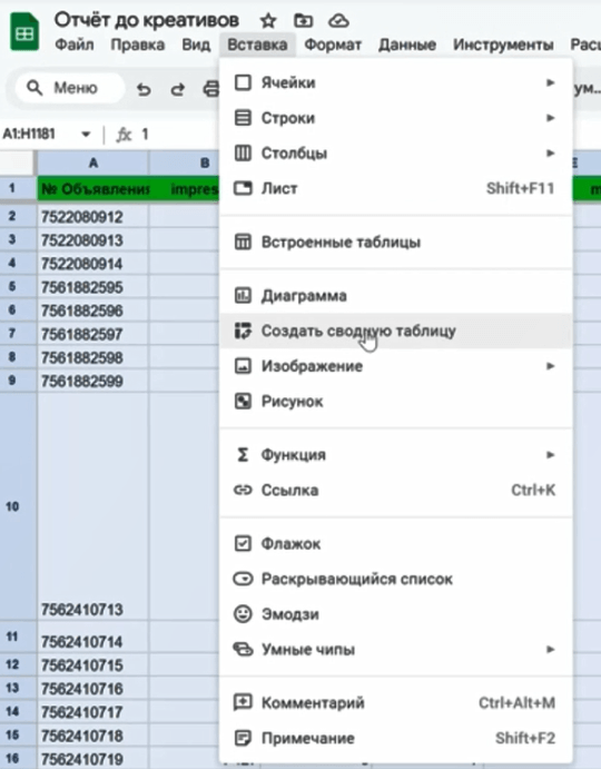 В главном меню выбираем “Вставка” -> “Создать сводную” -> “На новый лист”.