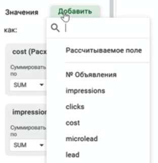 Далее нам нужно вывести метрики. Их будем добавлять в “Значения”. Это: