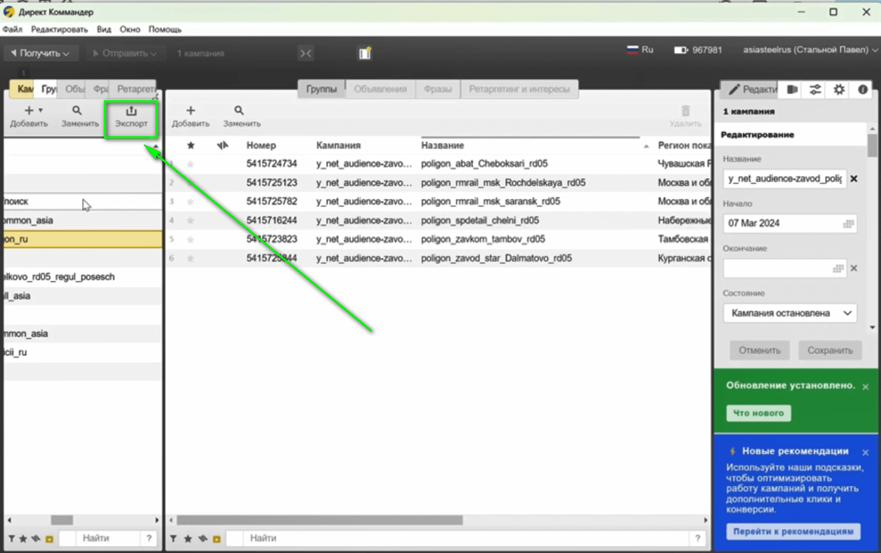 Вторая выгрузка делается из Директ Коммандера, поскольку в Мастере отчётов нельзя с вами выгрузить ссылки на изображение. Мы идём в Директ Коммандер. Открываем тот же логин, те же рекламные кампании. И делаем экспорт.
