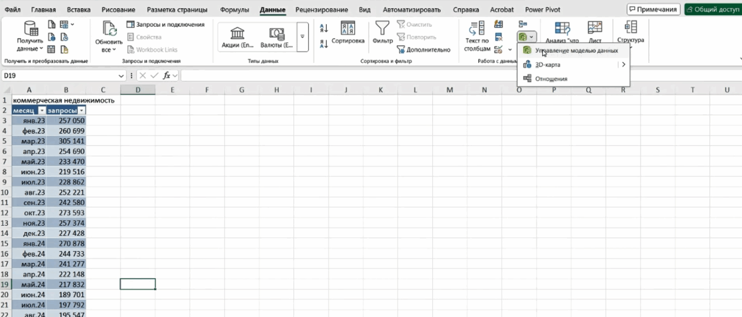 Здесь мы берём срез по частотности спроса по этому запросу в разрезе нескольких лет и нескольких месяцев, чтобы потом свести данные.