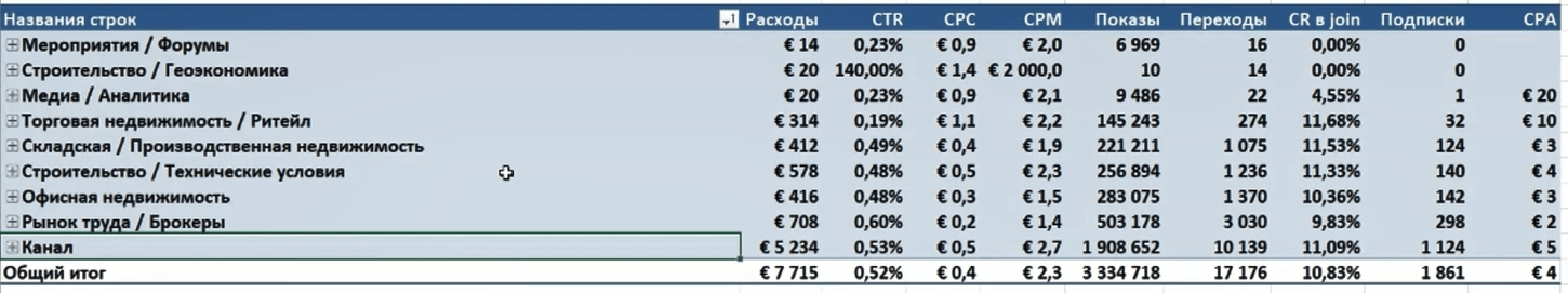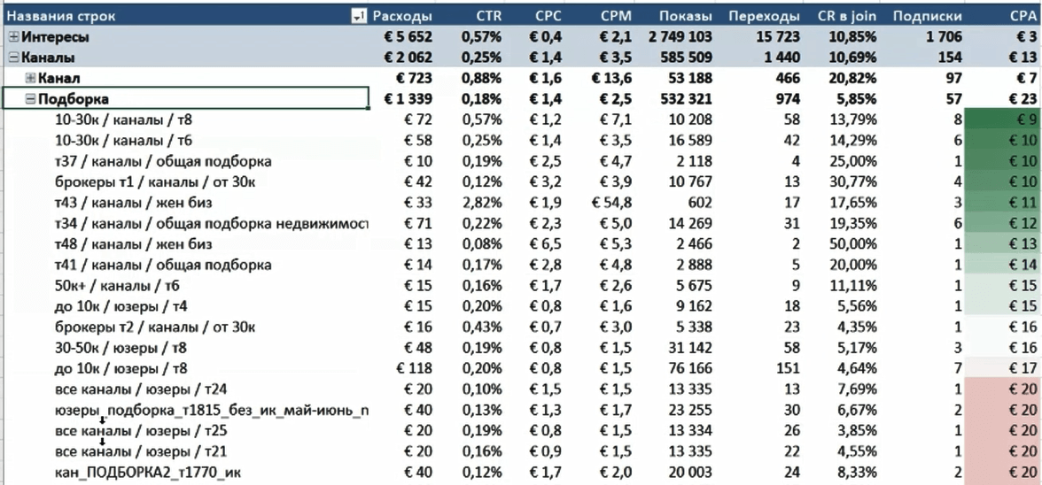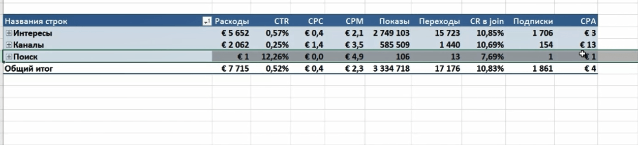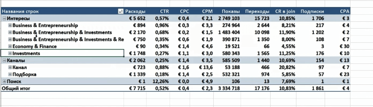 Вот в верхнем уровне выводы, какие мы видим: что самая дешёвая стоимость была на поиске (поиски Telegram там и там), но потрачено 1 евро и одна подписка. Данные не репрезентативны.