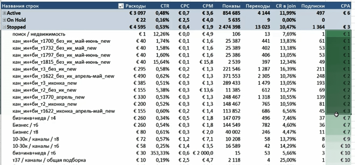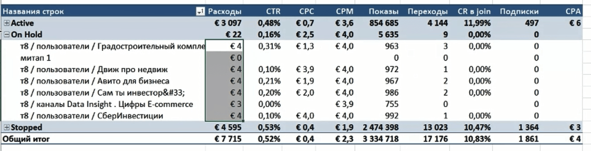 В чём польза отчёта? Разберём на примере остановленных кампаний. Для этого провалимся глубже в аналитику. Делаем вывод по отчёту, что вот на этих рекламных запусках были подписки, которые пришли по дешёвой стоимости, а они сейчас на стопе. Возникает вопрос: почему?