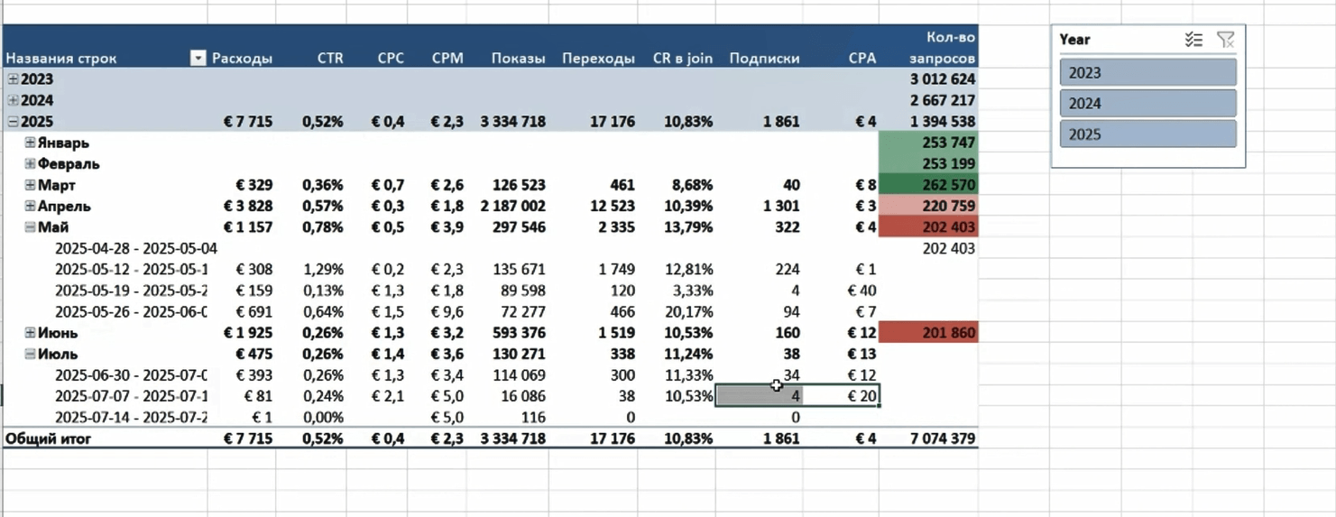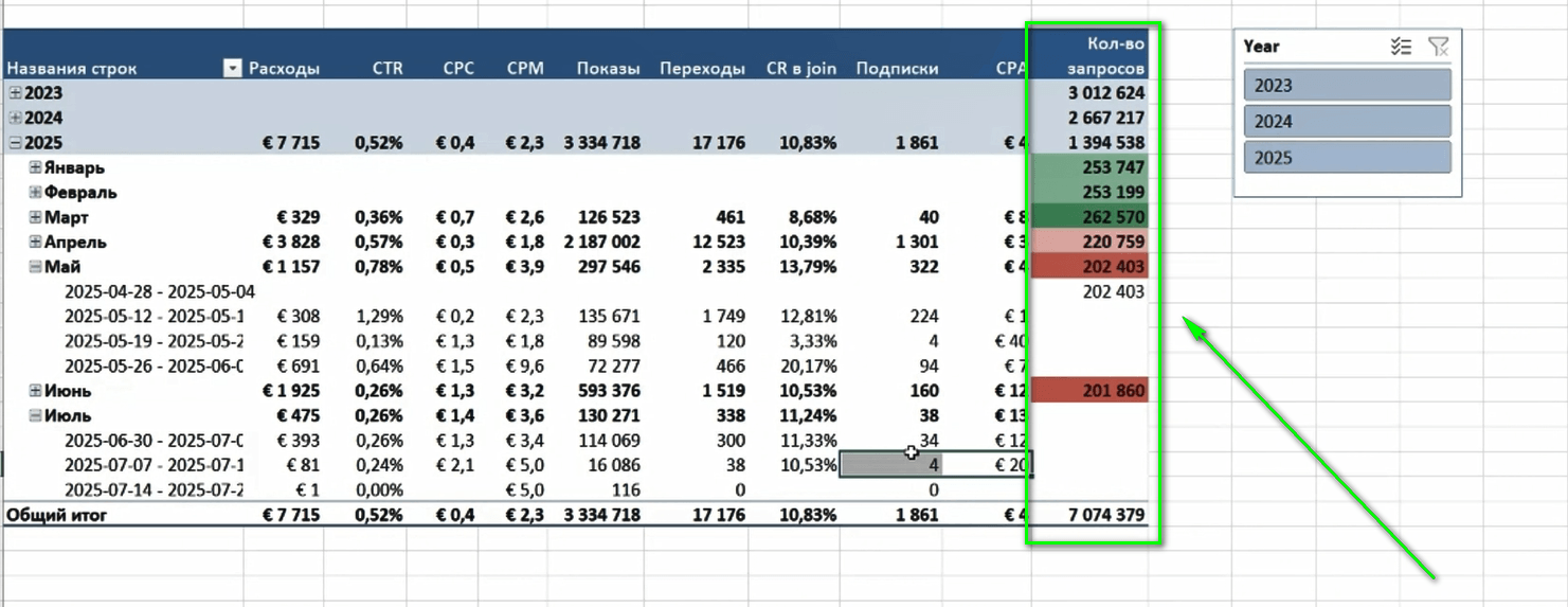 По июлю 2025 данных пока нет, потому что отчёт по прошествии месяцев формируется. Но здесь уже можно делать вывод, что частотный спрос может влиять на покупательский спрос, а именно на подписки даже.