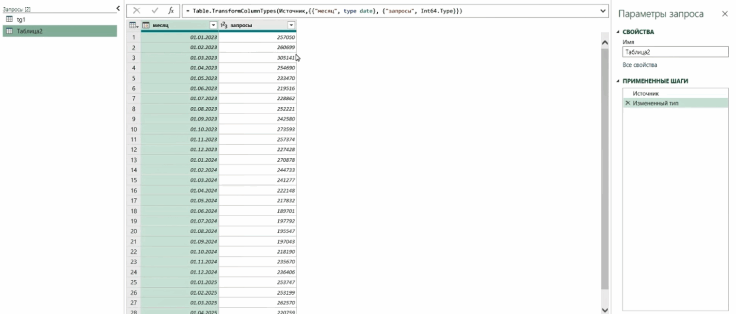 Таблица 2 – это, собственно, данные по частотности спроса. Здесь ничего не меняется, просто месяц формата. Главное — проверить, что отображалось с датой, и количество запросов.