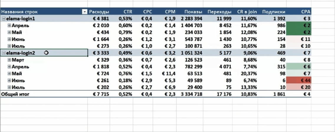 И что мы здесь можем видеть? Мы можем видеть, что просто на брендовый канал ведётся основная часть трафика и приводит средние результаты по стоимости подписки.