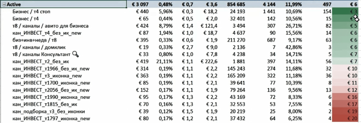 В группе “активные”, видим то, что работает сейчас. Ну, дешёвые, хорошие — да, ок. Видим, дорогие работают до сих пор. Опять же вопрос: почему? Потому что слишком дорогие каналы, как бы лучше бы их и почикать, порезать.