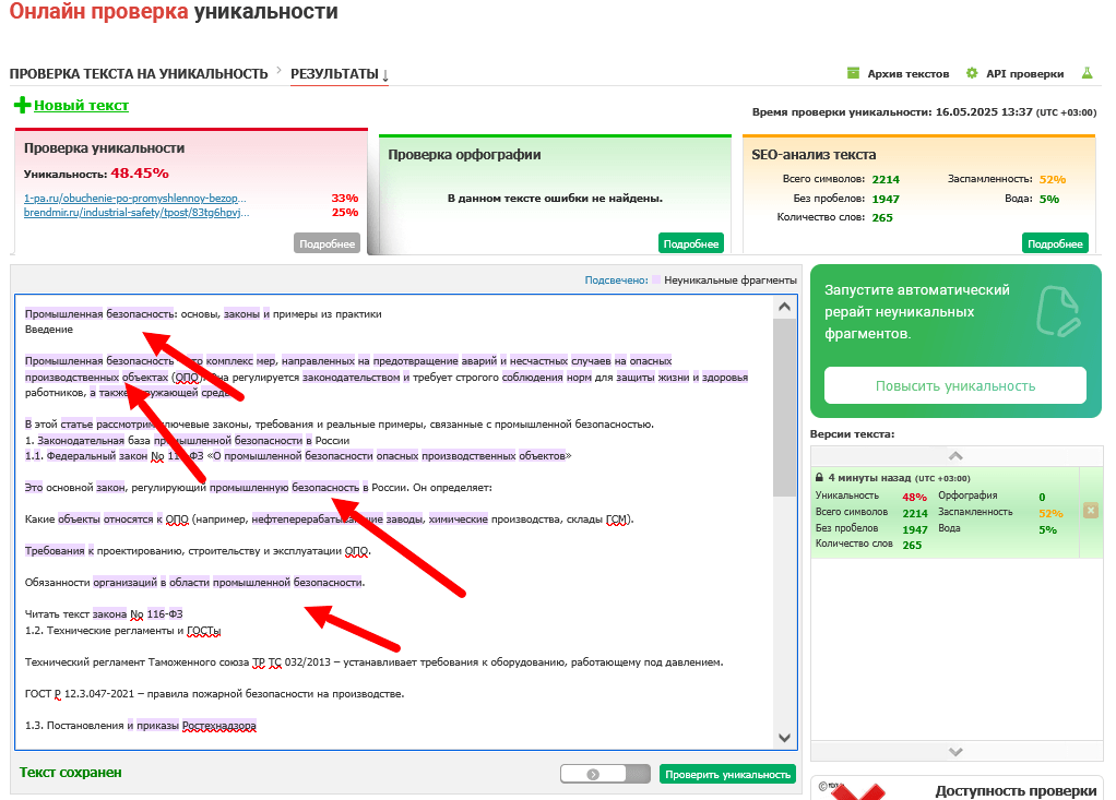 Повысить уникальность можно было только одним способом: покромсать ЗАКОНОДАТЕЛЬНО ЗАКРЕПЛЕННЫЕ термины и заменить их на бытовые. «Огневые работы» могут стать «работами с открытым огнем», «промышленная безопасность» — «охраной жизни и здоровья на заводах» и так далее.