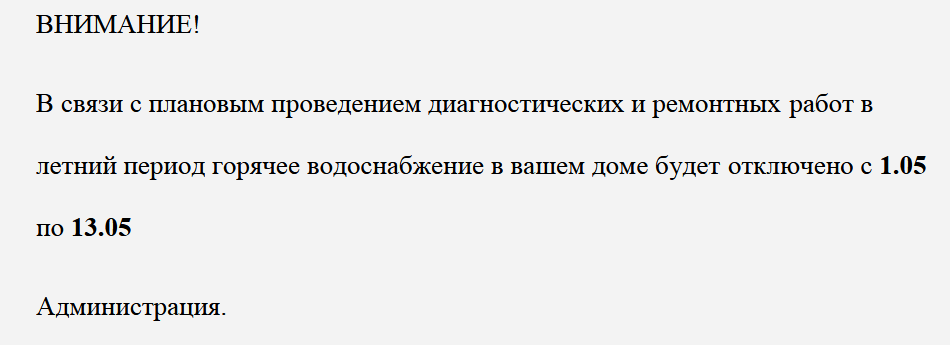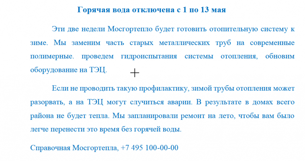 Но наш герой прочитает и скажет, что это объявление написали мошенники, а Мосгортепло написало бы НОРМАЛЬНО. То есть так: