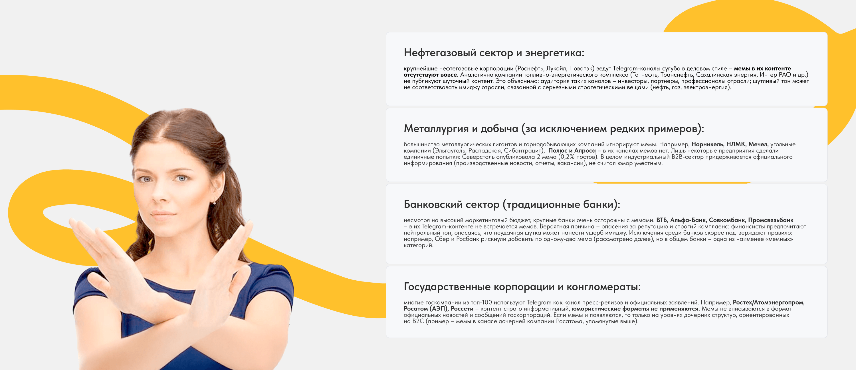 Несмотря на растущую популярность мемов, не все компании готовы включать их в коммуникационную стратегию. Компании из нефтегаза, металлургии, энергетики, госсектора и большинство банков остаются в зоне официального стиля. Их коммуникация — про формальность, стабильность и деловой tone of voice. Такая осторожность часто связана с консервативной бизнес-моделью и фокусом на более зрелую, профессиональную аудиторию.