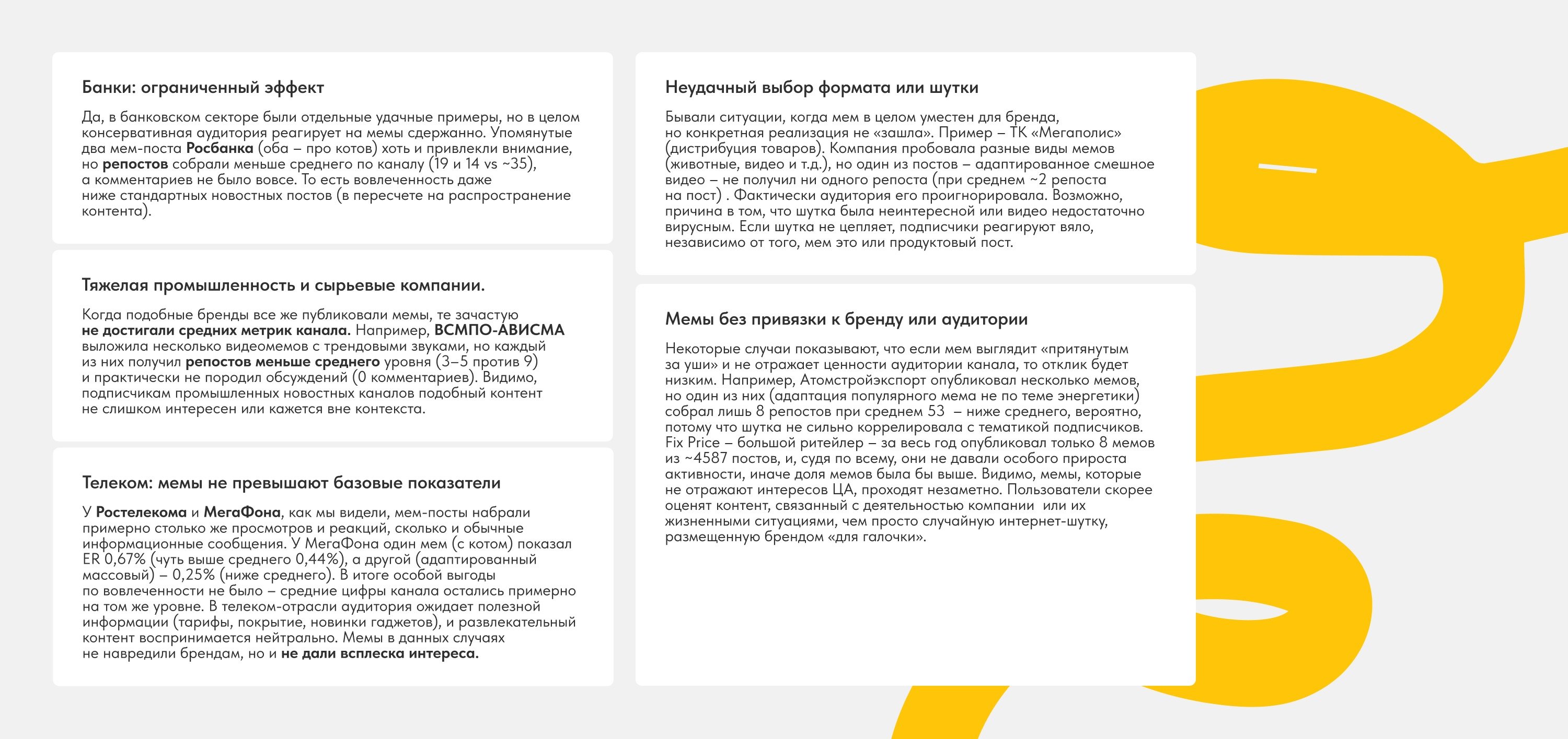 Похожая ситуация наблюдается в тяжёлой промышленности и у сырьевых компаний. Когда бренды из этих отраслей публикуют мемы, они часто не дотягивают до средних показателей по охвату и вовлеченности. Подписчикам таких каналов подобный контент не слишком интересен или кажется вне контекста.
