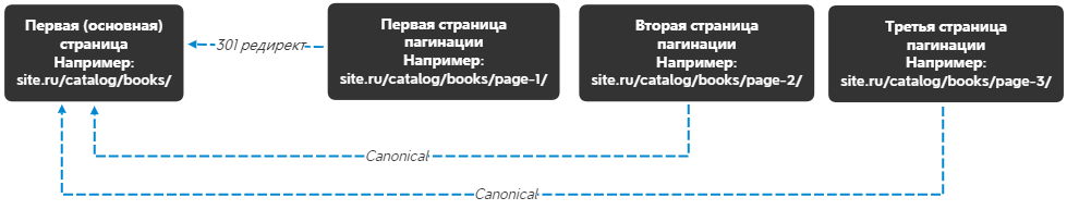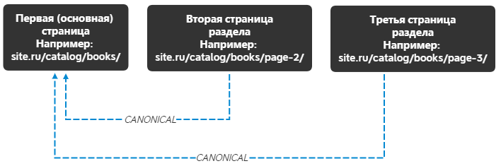 Например, на сайте есть раздел с книгами site.ru/catalog/books/, соответственно на всех страницах пагинации этого раздела: site.ru/catalog/books/page-2/ и т.д., необходимо указать канонический адрес следующего вида: