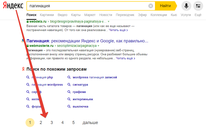 Пагинация — это разбиение одного большого раздела/подраздела на подстраницы с помощью нумерации. Используется в поисковых системах, интернет магазинах и прочих сайтах, где есть необходимость деления большого контента на несколько кусков. Обычно выглядит вот так: