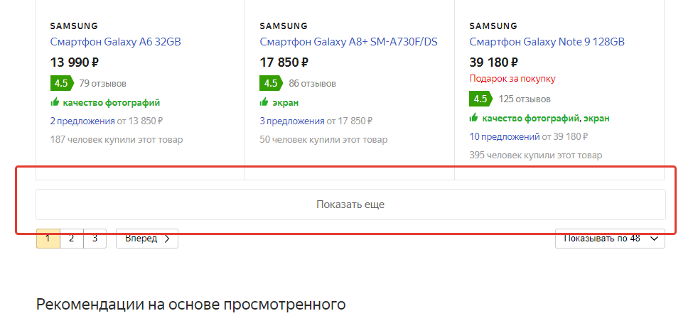 Этот вариант подразумевает помимо обычной нумерации, дополнительно реализовать кнопку “Показать ещё”. При нажатии на кнопку пользователю будет показано ещё n-ое количество товаров/услуг.