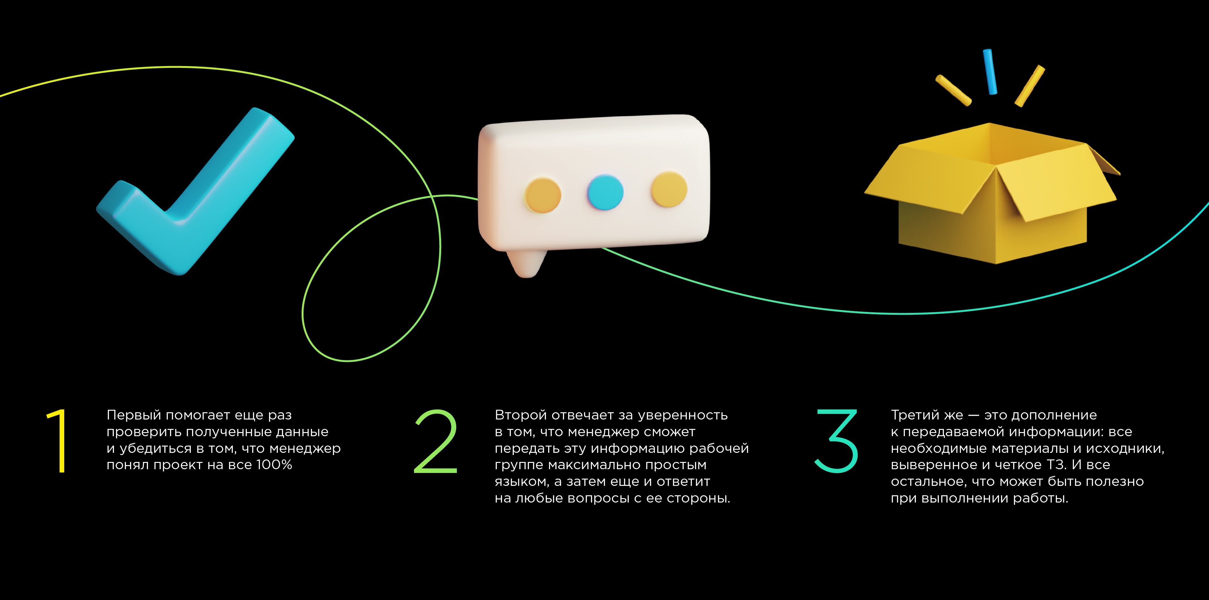 Если хотя бы одного из знаков нет — менеджер не может идти к дизайнеру, стратегу или копирайтеру. Точнее, может — но это будет не работа над проектом, а тренировка собственной стрессоустойчивости.