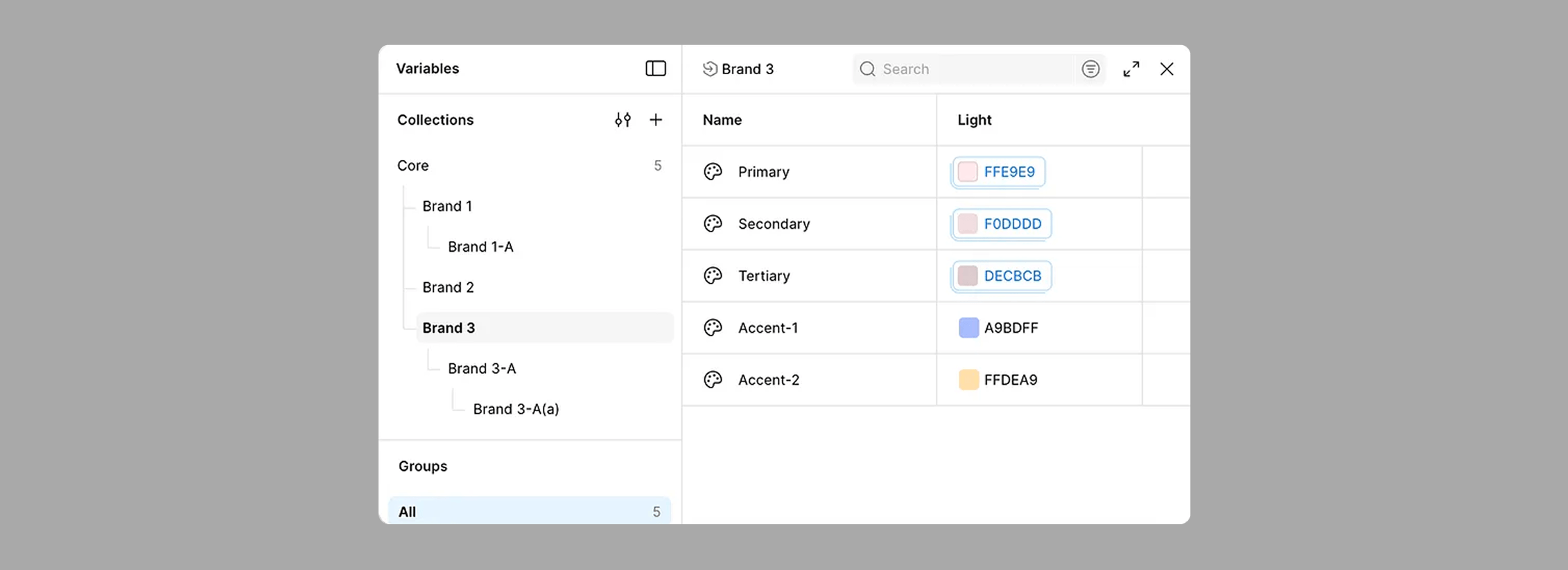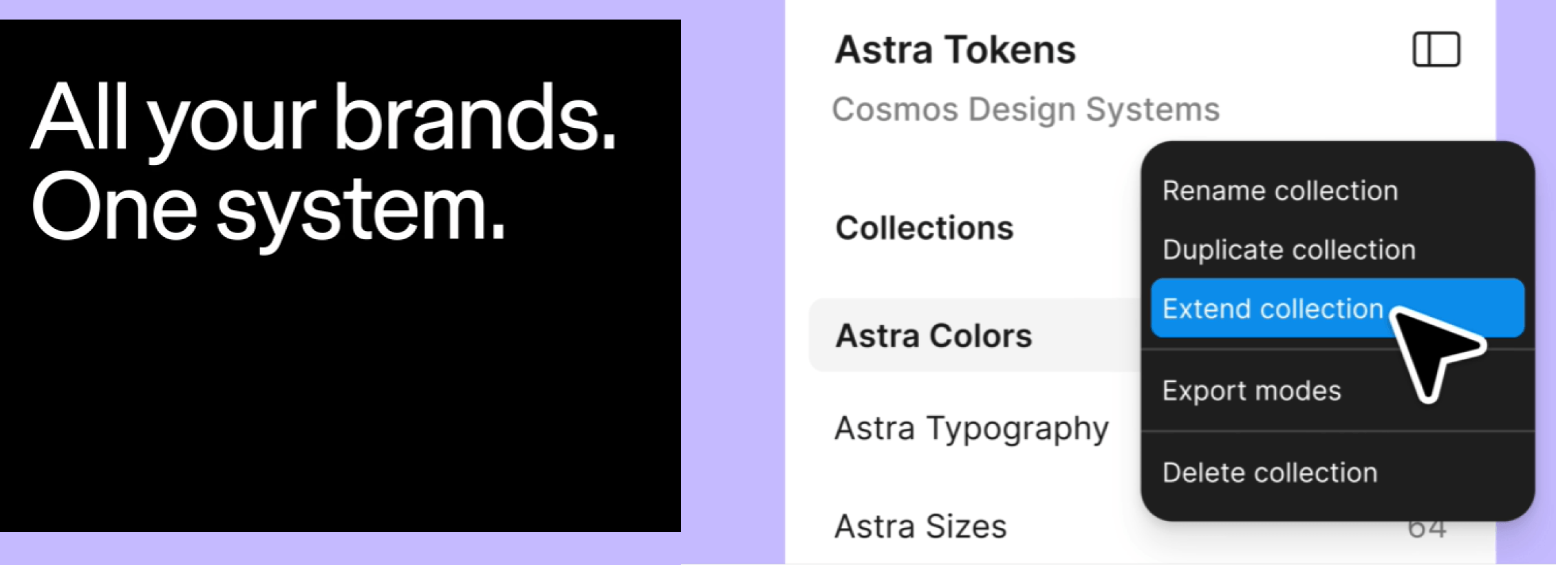 Теперь с помощью расширенных коллекций команды дизайн-системы могут поддерживать несколько брендов/продуктов, которым требуются собственные пользовательские темы, при этом сохраняя синхронизацию переменных с основной системой.