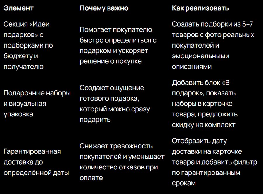 Локальные промо под сегменты. Подарки детям, подарки руководителю, идеи «до 1000 ₽» — удобные фильтры и подборки снижают трение выбора и увеличивают CR.