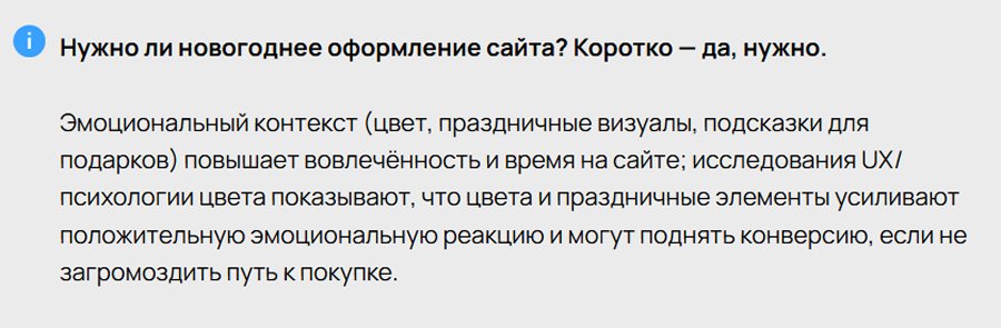 Бесплатная или ускоренная доставка до праздников. Обещание «доставим до 30 декабря» повышает конверсию у нерешительных покупателей. С учётом логистики важно чётко указывать сроки по регионам.
