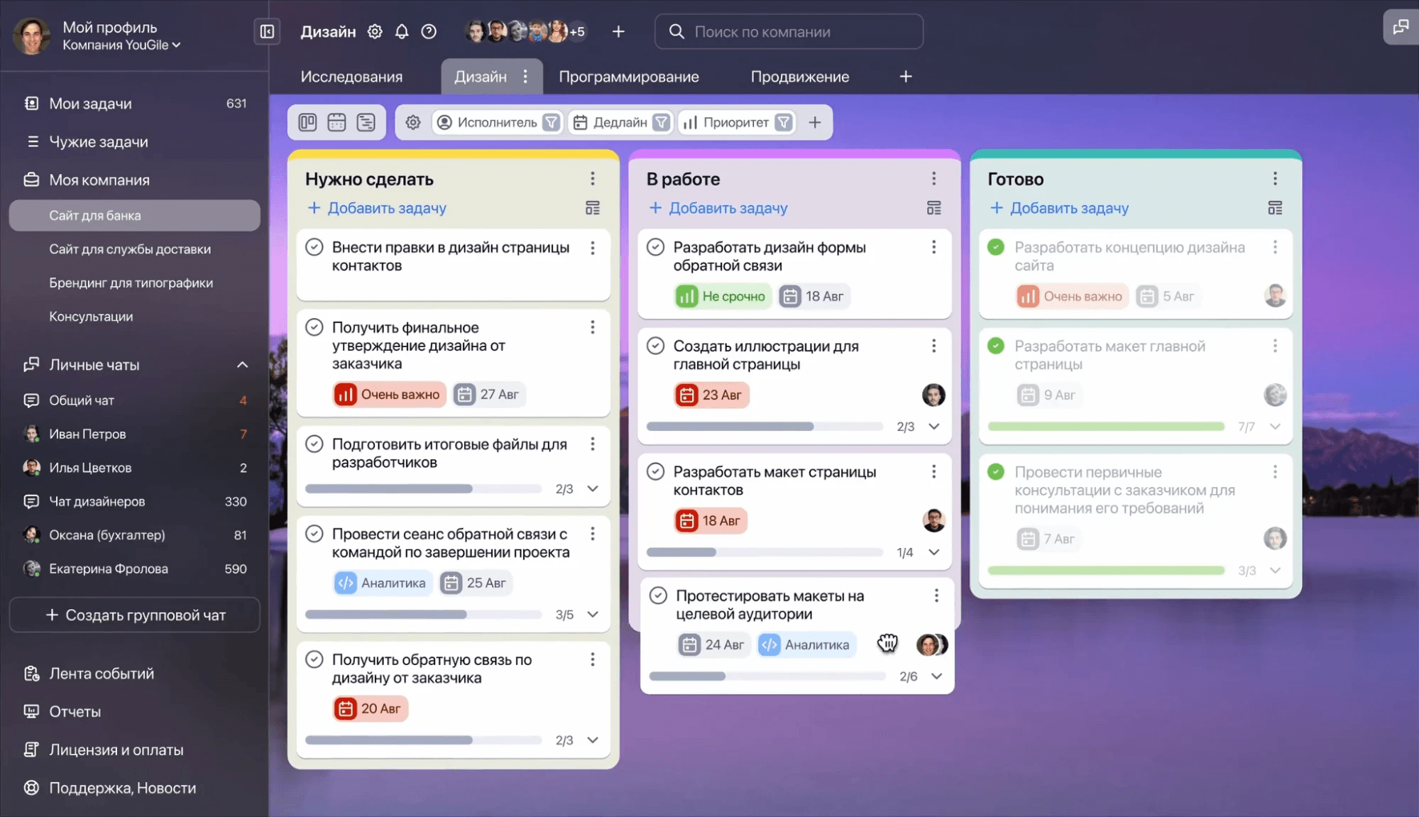 YouGile — система управления проектами для больших команд. Подойдет организациям, где переписка часто уходит в мессенджеры, а контекст задач рассыпается.