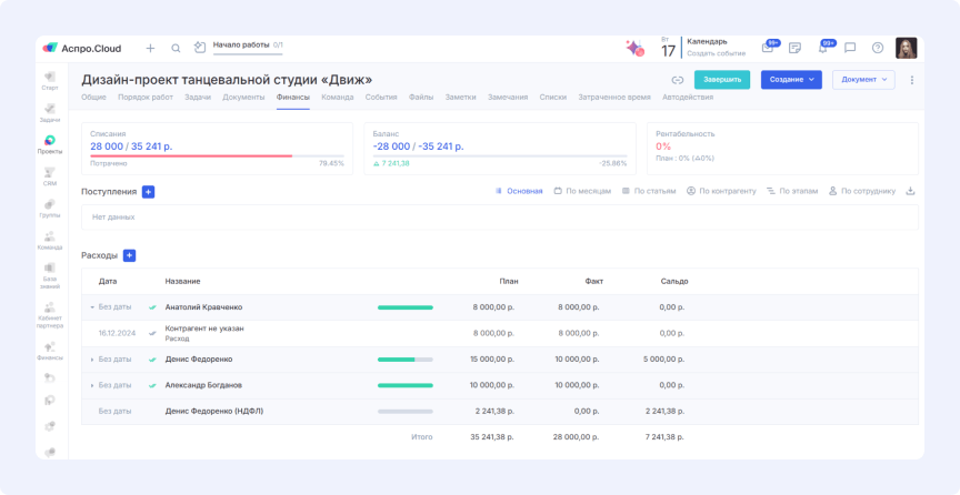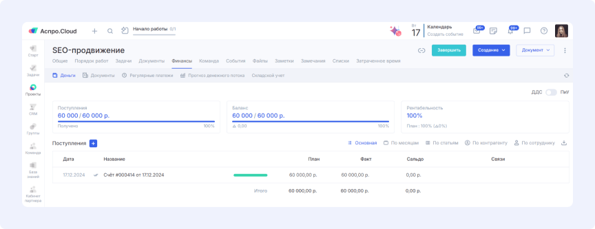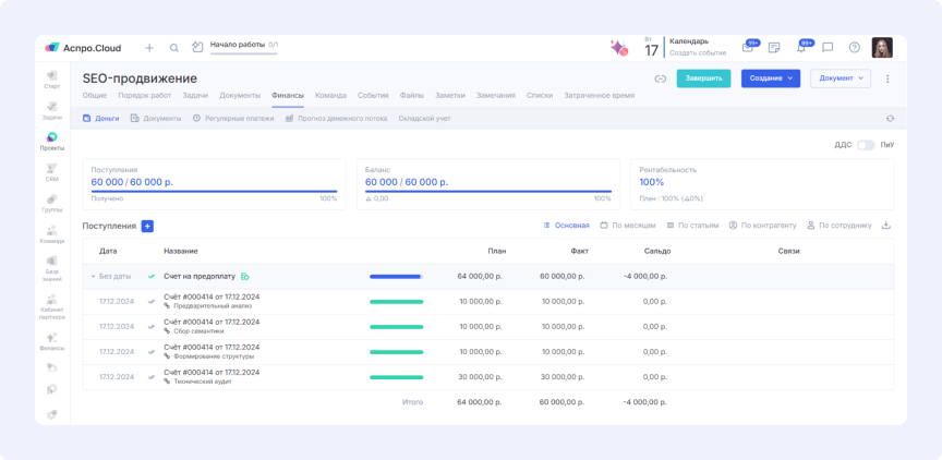 В разделе «Поступления» видите сумму к оплате от заказчика, в «Расходах» — стоимость работ для сотрудников. После завершения задач выставляете счет клиенту и добавляете фактические расходы на зарплату.